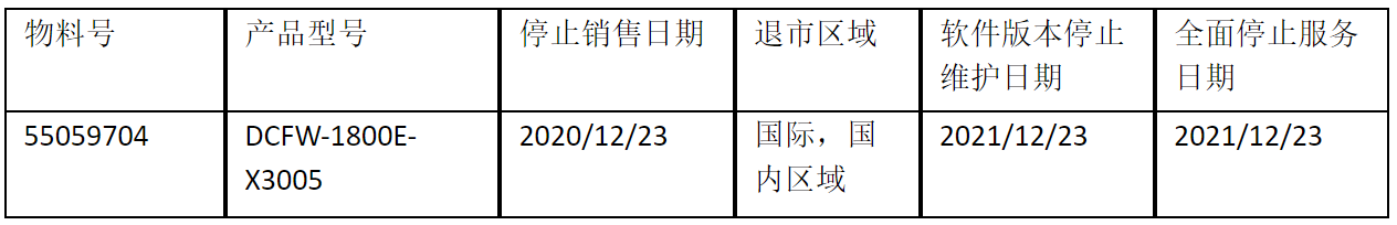 北京bbin宝盈集团官网数码云科信息技术有限公司正式通知您, 以上DCFW-1800E-X3005下一代防火墙(55059704)将于2020年12月23号停止接收新的订单(具体日期见上表),不再供货。给您带来的不便,敬请原谅。